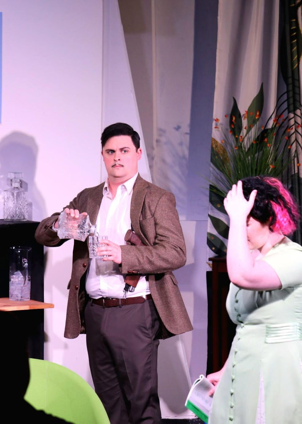 The set by Melissa and Tom Kiessling was simple yet effective. Living room setting with a couch, chairs, coffee table, fireplace, and a large window “overlooking” the water. The fireplace, stationed stage left, was used effectively to house the tiny soldiers that represent each of the guests. As they began to disappear one by one, the audience started to be more alert to see who was removing each soldier. One set piece really stood out in the dialogue, but not too much with its “stage presence" - the bearskin rug. I wish it could have been more prominent as the characters take clear direction around this specific piece for momentary dialogue. It was placed in a location that was difficult to see from some seats in the audience. Additionally, the costumes, by Melissa Kiessling and Lazuli Ritteler, were modest and clear for the time period of Christie’s play.